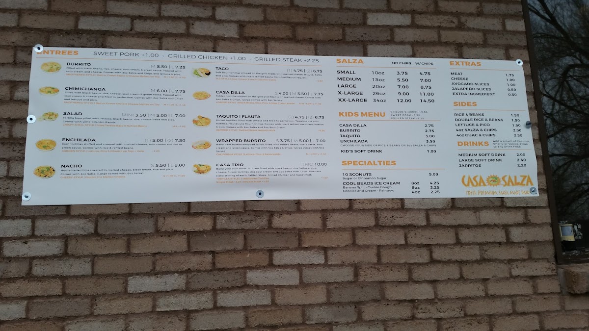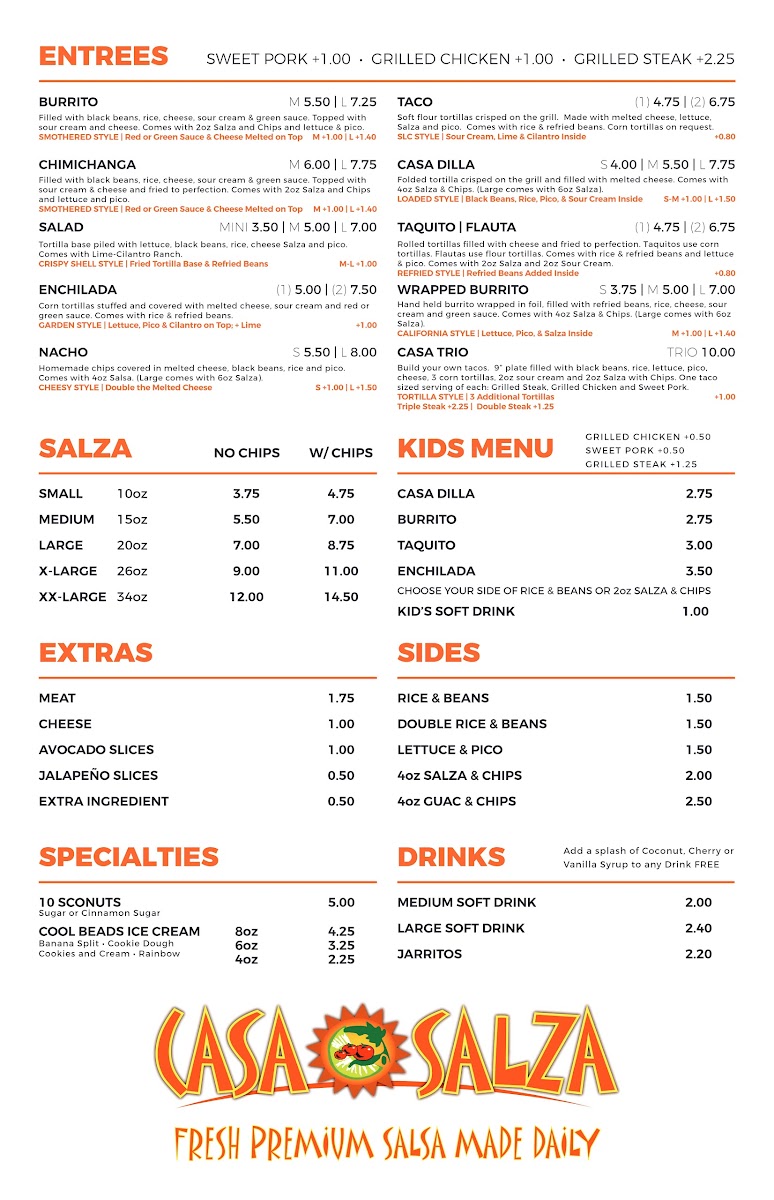 Handheld burrito wrapped in foil, filled with refried beans, rice, cheese, sour cream, and green sauce. Comes with 6 oz. salza and chips.