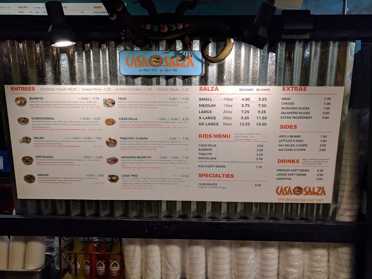 Build your own tacos. 9” plate filled with black beans, rice, lettuce, pico, cheese, 3 corn tortillas, 2 oz. sour cream, and 2 oz. salza with chips. 1 taco sized serving of each: grilled steak, grilled chicken and sweet pork.